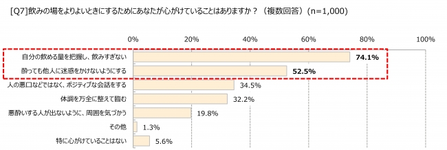 飲みの場をよりよいときにするためにあなたが心がけていることとしては、「自分の飲める量を把握し、飲みすぎない(74.1%)」「酔っても他人に迷惑をかけないようにする(52.5%)」と、まずは自分で意識をしっかりもって飲み会に臨む、という人が多いことがわかりました。