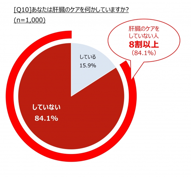 目に見えて影響がわかりやすい「肌」を抑えて、なかなか影響を感じにくい「肝臓」が第1位になっていることからも、飲酒による肝臓への影響への関心の高さが伺えます。しかし、肝臓ケアには取り組めていない人の方が圧倒的に多い(84.1%)という現状が浮き彫りに。
