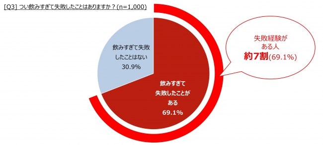 「全く面識のない人や店の店員をマッサージした」「取引先の偉い人にため口で話した」「無人駅まで行ってしまい警察署に泊めてもらった」など、飲み過ぎて失敗したエピソードが続出。失敗経験からか、「飲み方を改めようと思う」人は約7割(68.6%)も。