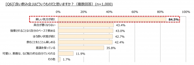 良い飲み会はどういうものか聞いてみたところ「楽しい気分が続く」が84.5%で断トツの1位。