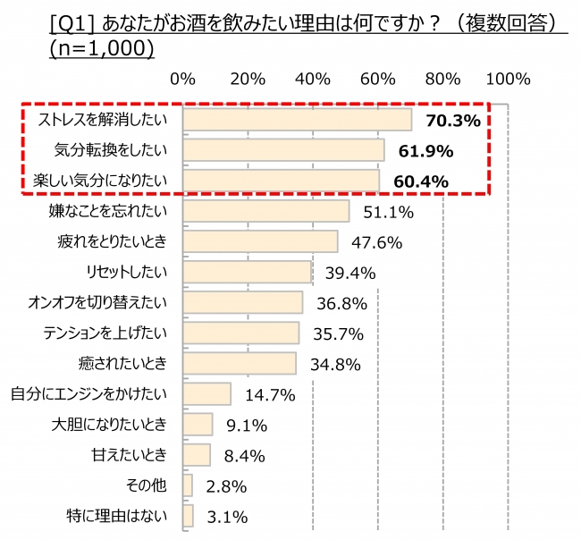 1.お酒を飲みたい理由、第1位は「ストレス解消 (70.3%)」 。