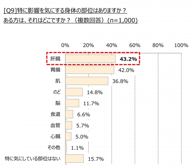 飲酒による影響を気にする身体の部位は「肝臓」(43.2%)が最も多く、次いで「胃腸」(42.0%)、「肌」
