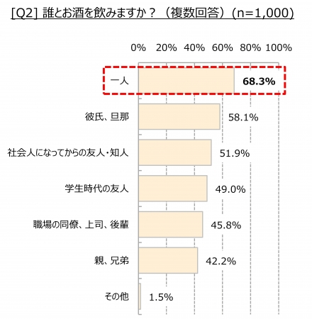 誰とお酒を飲みますか?という質問に対しては、「一人」という回答が最も多く、約7割(68.3%)にのぼるという結果に。他にも、「彼氏、旦那」「社会人になってからの友人・知人」「学生時代の友人」と飲むという人が約半数にのぼり、様々な交友関係の中で飲酒を楽しむ様子が伺えます。