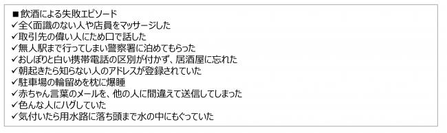 「嘔吐してしまった」、「終電を逃したり寝過ごして帰宅できなくなった」、「財布などの貴重品をなくした」など、身に覚えがある方もいるのではないでしょうか。他にも様々な飲酒による失敗エピソードが続出しましたので一部ご紹介します。