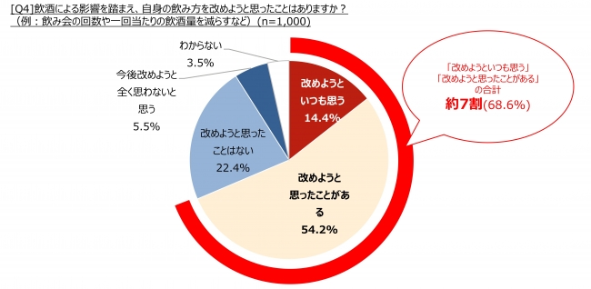 思ったことはありますか。」という質問に対し、「改めようといつも思う(14.4%)」「改めようと思ったことがある(54.2%)」という人が合計約7割にものぼっていることから、何かしら飲酒習慣を改善したいという思いが垣間見えます。