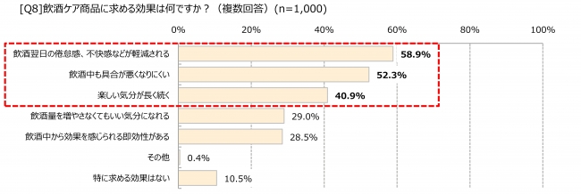 飲酒ケア商品に求める効果トップ3は「翌日の不快感の軽減(58.9%)」「飲酒中も具合が悪くなりにくい