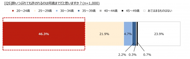 また、「酔いつぶれても許されるのは20代前半まで」という回答をする人が最も多い結果(46.3%)となり、ある程度年を重ねたら、酔いつぶれるほど飲むのはよくない、と考えているようです。