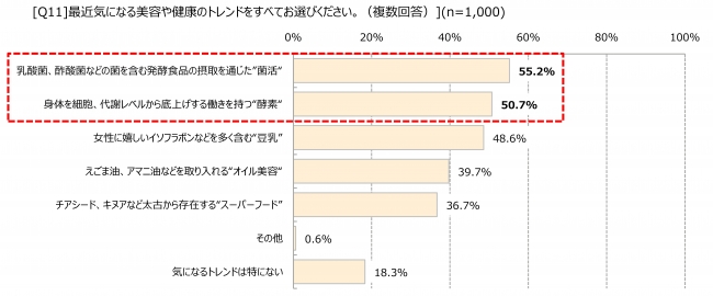 「最近気になる美容や健康のトレンド」について聞いたところ、乳酸菌や酢酸菌などの菌を含む発酵食品の摂取