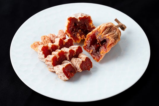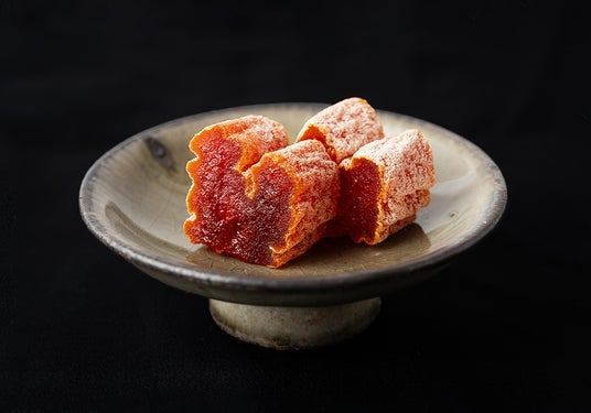 常温や冷蔵での保管時は、白粉(柿の糖分が表面に出てくる状態)が吹き、赤から白く表面の色が変化していきます。天授柿は通常の干し柿より水分量が多いため、羊羹のようにねっとりした食感に仕上がっています。