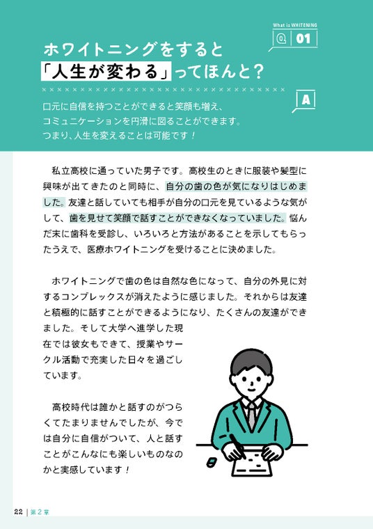 本書では、歯科医師が行う「医療ホワイトニング」について非医療ホワイトニングとの違いを丁寧に解説するとともに、著者自身の患者さんとのエピソードも交えて、等身大の「医療ホワイトニング」についてわかりやすく紹介しています。加えて、近年の歯科医療情報や年齢別の歯科的リスクも紹介し、一般の方に広く歯科を理解して頂ける内容になっています。