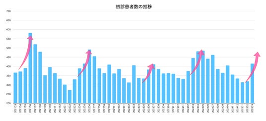 「足のクリニック 表参道」では、春から夏の時期にかけて毎年外来患者数が増加することが分かっています。冬の時期と比較すると、その数は約1.6倍ほど。「春は足が痛くなる季節」なのです。