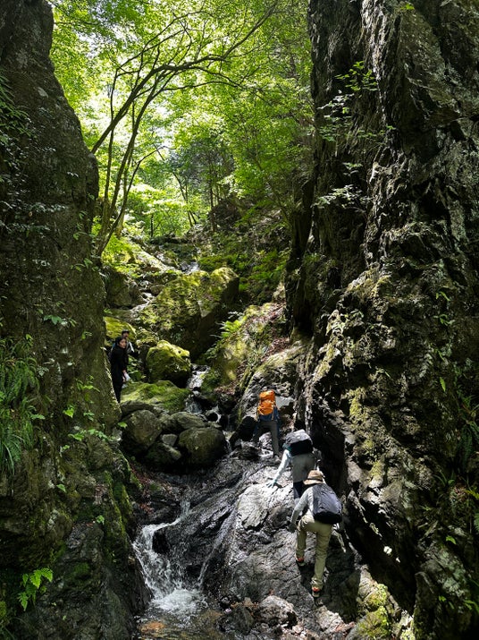 年2回行うアドベンチャープログラムの様子。登山ルートやペース、休憩のタイミングは全て子ども達が決めて、大人は命の危険がありそうな時以外は何も言わずにただ見守る、本格的なアドベンチャーです。秋にはキャンプを行っています。