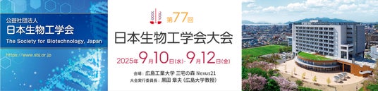 日本生物工学会(The Society for Biotechnology, Japan, 会長:清水 浩 [大阪大学] )は、発展著しいバイオテクノロジー分野において我が国を先導する中心的学会です。第77回日本生物工学会大会(2025年9月10日~12日、広島工業大学 五日市キャンパス 三宅の森 Nexus21、実行委員長:黒田 章夫 [広島大学])は、バイオテクノロジー分野の最先端の研究成果と技術情報(一般講演632演題、シンポジウム27領域133演題、受賞講演10演題)が集結し、バイオエコノミー、バイオリファイナリー、バイオマテリアル、プロテインエンジニアリング、ゲノム編集技術、合成生物学、バイオインフォマティックス、オミクス解析、マイクロバイオーム(微生物叢解析)、ナノバイオロジー、バイオセンシングなど社会的注目度の高いフィールドにおける高度な学術発表が行われます。