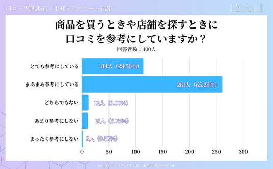 株式会社LeveL.Lは、特に実店舗を持つ事業者様へのマーケティング支援を行う中で、口コミが集客や売上に与える影響の大きさを実感してまいりました。そこで今回、消費者が実際にどの程度口コミを参考にしているのか、どのような口コミが購買や来店の判断に影響するのかを明らかにするため、400人を対象とした実態調査を実施いたしました。