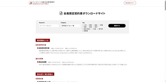 「会員限定契約書ダウンロードサイト」(https://contract.ambitiouslaw.com/)で新規ユーザー登録の手続を行っていただくことで、必要な契約書を無料でご利用いただけます。