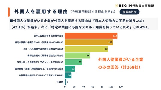 ~外国人雇用の主な理由は「人手不足」42.1%、「スキル確保」38.4%。BEGIN行政書士事務所が全国の会社経営者・役員1,000人を対象に実施~