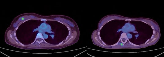 FDG-PETにおける集積がSUV5からSUV1へ低下。治療1カ月後の時点で触診上腫瘍が確認できなくなり、その後2~4カ月の画像診断においても腫瘍は確認されませんでした。(効果判定はCR)