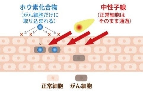 BNCTは、ホウ素を含む薬剤を体内に取り込み、中性子線を照射することで、がん細胞のみを選択的に破壊する放射線治療です。