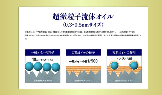 万象は、科学的有効成分の高分子配合から特殊な製法処理技術で化合し、新たな流体理論を取り入れ開発された「非ニュートン系粘弾性オイル」です。万象オイルは0.3~0.5nmの超微細なナノ粒子オイルで、エンジン内細部まで浸透し、強力な洗浄・防錆・冷却等の多機能効果を発揮します。