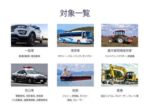 一般乗用車・トラック・建設機械・船舶・発電機・油圧機器・工作機械など、70種類以上のエンジン・機械装置に対応。 「一車に1本」で、個人から法人、自治体・産業用途まで幅広くご利用いただけます。