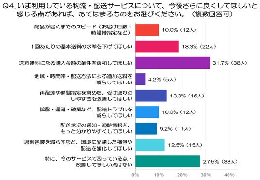 - 一方で、「特に、今のサービスで困っている点・改善してほしい点はない」と回答した人も27.5%(33人)と一定数存在しています。現状の物流・配送サービスに大きな不満を抱いていない層がいることも、この結果から読み取れます。