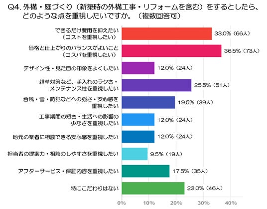 - 重視点として最も多かったのは「価格と仕上がりのバランスがよいこと(コスパを重視したい)」36.5%(73人)でした。外構や庭づくりは、見た目だけでなく使い勝手や耐久性にも関わるため、「安ければよい」ではなく、費用に見合った仕上がりかどうかを見極めたい人が多いことがうかがえます。