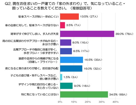 - なお、「特に気になっていることはない」34.5%(69人)も多く、現状の外まわりに大きな困りごとを感じていない人も少なくない結果でした。