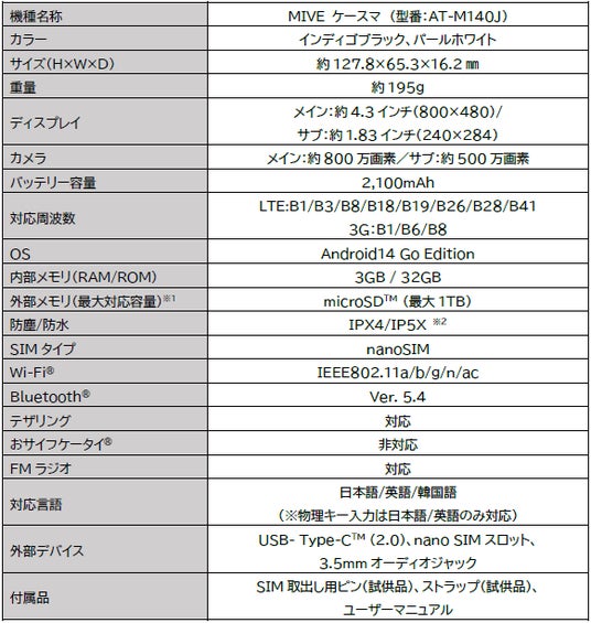 OSには「Android14 Go Edition」を搭載、背面には約800万画素のカメラを装備し、バッテリーは1日持ち歩いても充電の心配がない約2,100mAh、さらにIPX4/IP5Xの防塵防水ですので、お出かけ先でも安心してお使いいただけます。