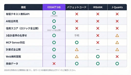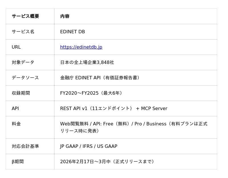 Cabocia株式会社(本社: 東京都港区、共同代表取締役: 小池陸)は、日本の全上場企業3,848社の有価証券報告書データを構造化し、AI分析を提供するWebサービス「EDINET DB」のβ版を2026年2月17日に無料公開しました。
