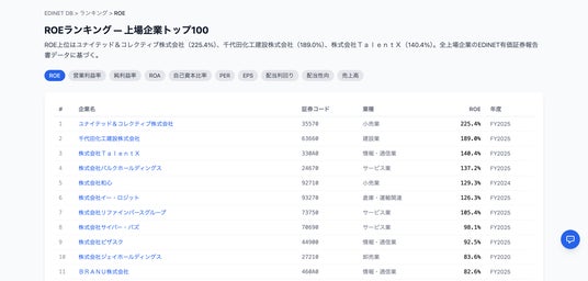 全3,848社を各種指標(ROE、売上高、信用スコア、etc…)でランキング表示。登録不要で閲覧可能