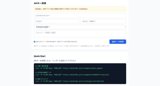有価証券報告書に記載されたテキスト情報(事業の内容、経営方針、リスク情報、MD&Aなど)78万件を構造化して提供。無料プランでも利用可能なAPIとして、有報テキストの網羅的な取得に対応しています。