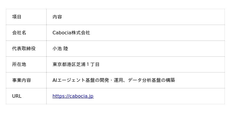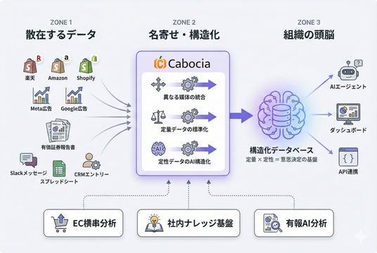 Cabociaは、上場企業を含む法人向けにデータ分析基盤の構築やAIエージェントの導入を手がけている会社です。代表はEC事業者向けの異なるモール・媒体のデータ名寄せや横串分析を設立前から続けており、設立後はECだけでなく、コンサルティング会社やマーケティング会社向けに、社内ナレッジを構造化してAIエージェントから参照可能にする基盤も提供しています。
