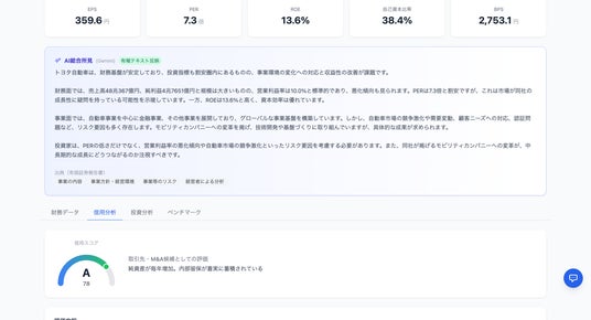 定量・定性情報をAI(Gemini)が統合分析し、企業ごとに総合所見を生成(トヨタ自動車)
