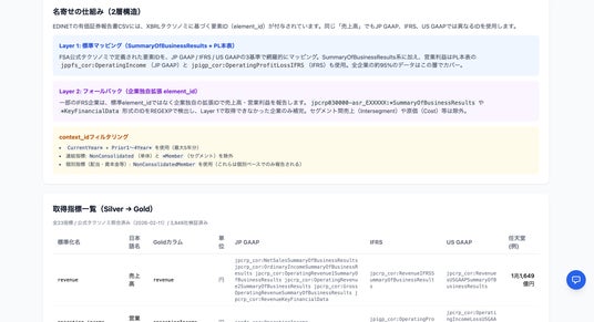 全3,848社×最大6年分(FY2020~FY2025)のデータを収録。名寄せのマッピング定義(各会計基準の科目ID対応表)はサイト上のドキュメントページ(/docs/metrics)で全て公開しており、どの基準のどの科目がどう統合されているかを確認できます。