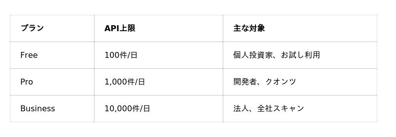 REST APIやMCP Serverから構造化された財務データを直接取得し、独自の分析パイプラインに組み込めます。1回のAI会話で消費するAPIリクエストは2~3件程度。Free(100件/日)でも1日に30回以上の分析会話が可能です。Pythonスクリプトからの一括取得にも対応しています。