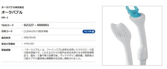 本製品は、このような口腔ケア用途の機器として、福祉用具情報システム(TAIS)に登録されています。