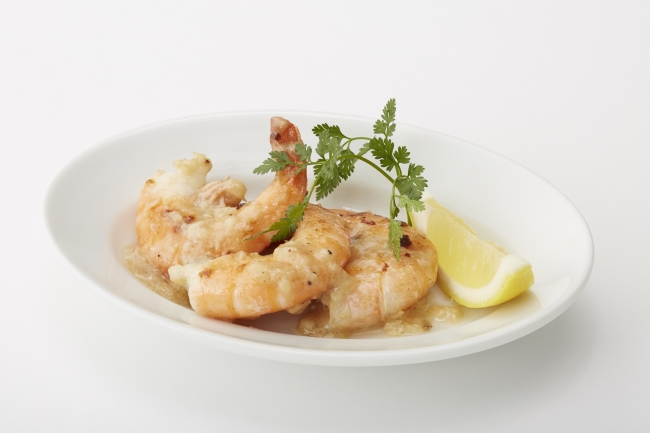 ガツン!とガーリックを感じるオイルとアンチョビをぷりぷりの海老3尾に絡めました。