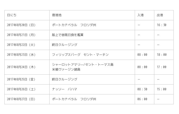 オアシス・オブ・ザ・シーズによる皆既日食クルーズは、2017年8月20日にフロリダ州オーランド(ポートカナベラル)を出港し、フィリップスバーグ(セント・マーチン島)、シャーロットアマリ―/セント・トーマス島(米領バージン諸島)、ナッソー(バハマ)へ寄港する7泊8日の行程となります。