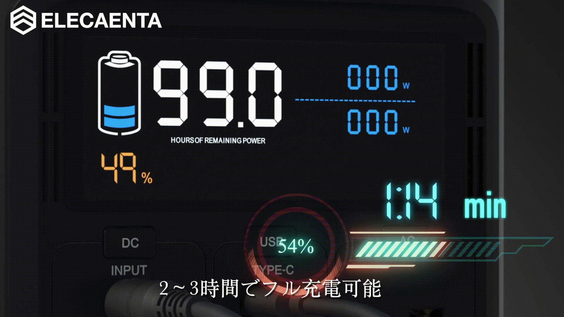 S600Wは大容量740Whのポータブル電源にも関わらず、200WのACアダプター入力とUSB TypeC PD100W入力を同時に使用すれば、最大300Wの入力ができ、唯の2~3時間でフル充電が完了します。