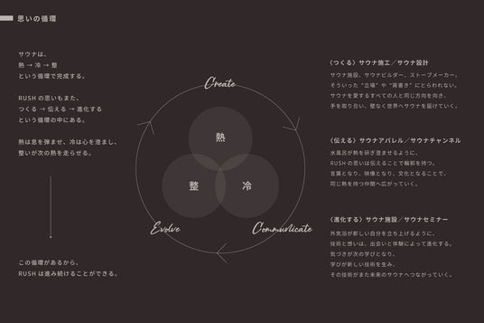 サウナが「熱→冷→整」の循環で完成するように、RUSHの活動も「つくる(施工・設計)」「伝える(アパレル・メディア)」「進化する(施設運営・セミナー)」という3つのサイクルを回し続けています。 RUSH BASEは、この循環を物理的に体験できる場所として設計されました。