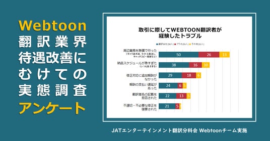 このたび、日本翻訳者協会(JAT)エンターテインメント翻訳分科会Webtoonチームでは、Webtoon(縦読み漫画)翻訳に携わる翻訳者を対象に、労働環境や契約、報酬、業務内容の実態を知るためのアンケート調査を実施しました(調査期間:2025年7月11日~8月11日)。