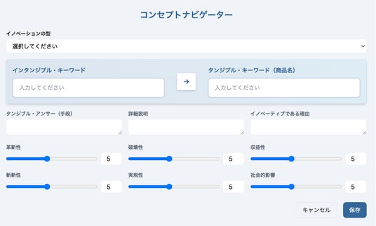 日本人のユーザーアンケートを読み込ませたAIが、スコアリング済みのランキングで生成したイノベーションのコンセプト1500案を出発点に「人間のイノベーションの認知を抽象化した30の発想法」を元に人間の思考で追加・深掘りができる「コンセプトナビゲートシステム」を新たに搭載。