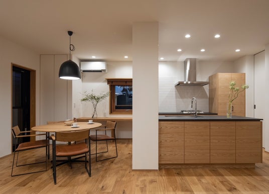 窓の数はあえて控えめにし、プライバシーを重視しつつも、採光に工夫を凝らして室内は常に明るさと開放感を感じられる設計になっています。 リビングには柔らかな光が差し込み、 季節に関係なく家全体に温もりを感じられる空間に仕上げられています。