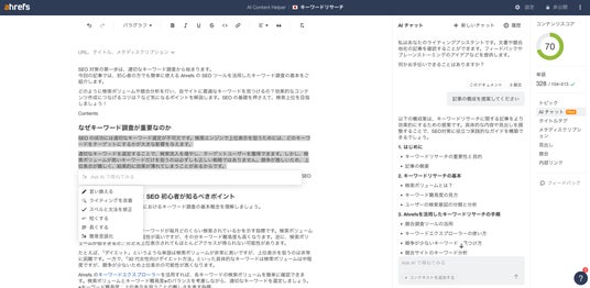 Ahrefs の「AI コンテンツヘルパー」で、コンテンツの網羅性をスコアリングしながら、競合分析に基づいた最適な記事作成をAI がサポートします。