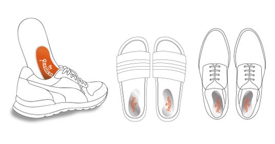 表面をシリコンで仕上げたことで直接踏んでも滑らず、内履きのスリッパやスリッポンに貼り付けて使うことも出来るので、室内履き、中敷きの無い靴にも使用できます。直接踏んでも違和感のない人間工学の考え方に基づき設計されています。