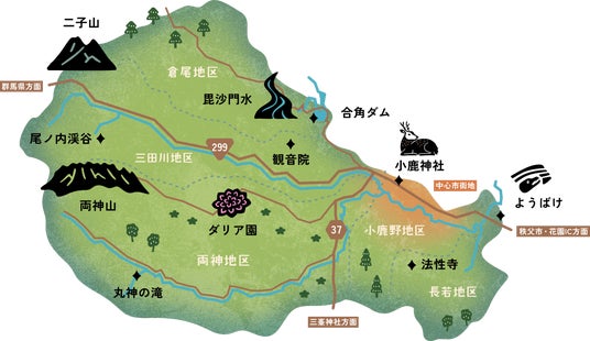 小鹿野町は、埼玉県の北西部に位置し、秩父郡1市4町の1つです。秩父郡内で唯一鉄道は通っていませんが、日本百名山「両神山」を始め、日本の滝百選「丸神の滝」、平成の名水百選「毘沙門水」など数々の百選を持ち、美しい自然と山里の景観を備えています。小鹿野の地名の起こりは平安時代に遡り、江戸時代には東京・山梨・長野を結ぶ街道の要所となり、他地域との盛んな交流によって多種多様な祭り・農村歌舞伎や神楽など独自の歴史と文化が育まれました。かつての宿場町としての面影を現在も継承し、「おもてなし」の心と人情あふれる人々が魅力です。