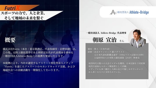 株式会社Futrix(本社:東京都港区、代表取締役:岩野裕樹)は、この度、元陸上競技選手である朝原宣治氏が代表理事を務める一般社団法人Athlete-Bridge(本社:大阪府大阪市、代表理事:朝原宣治)との提携を発表いたします。