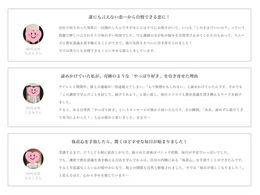 「らぶスタ」の受講生からは、潜在意識を書き換えることで、長年の悩みが解消され、奇跡のような変化を体験した喜びの声が多数寄せられています。
