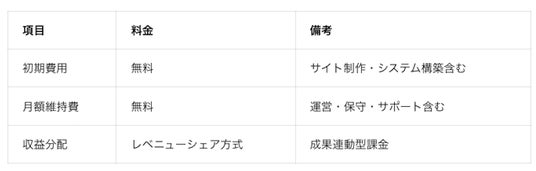項目料金備考初期費用無料サイト制作・システム構築含む月額維持無料運営・保守・サポート含む収益レベニューシェア方式成果連動型課金
