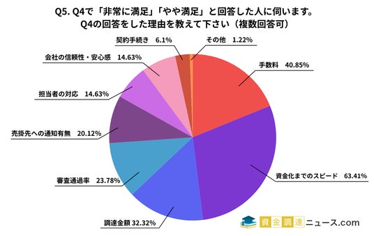 満足度が高い理由として、最も多かった回答は「資金化までのスピード(63.41%)」でした。これは、Q3で「資金化までのスピード」が最も重視されていたことから、実際にファクタリングを利用した際に期待通り、あるいはそれ以上の迅速さを実感できたことを示しています。ファクタリングの最大のメリットが迅速な資金調達であることを裏付ける結果です。